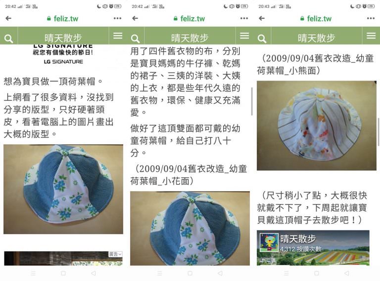 2009年只簡單記錄了為寶貝做的幼童荷葉帽成果。最近翻出舊照,完整分享利用舊衣改造做雙面荷葉帽/淑女帽的流程,利用現有的舊衣褲當材料,做法也很簡單,讓舊衣物又有了新生命,我很喜歡。文末附上參考版型連結,給需要的朋友參考囉!