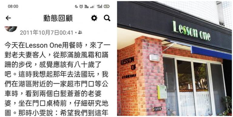 滿喜歡臉書的回顧功能,總能回憶一下多年前的生活經驗、所思所想。這天看到九年前去Lesson One用餐時,目睹的暖心場景。以前寫食記時有記在文末,特別再記下來,提醒自己,時時溫柔友善待人。