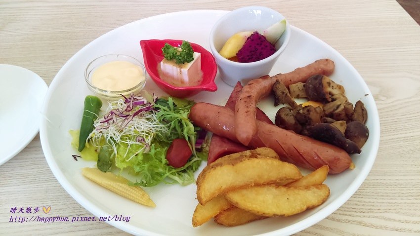 德式早餐的內容包含:德式香腸、火腿、太陽蛋、沙拉、薯條、水果、豆腐、炒菇、麵包。附餐飲料可選紅茶、綠茶或咖啡。
