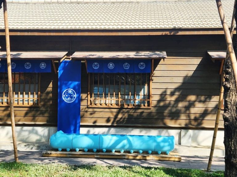貓貓蟲咖波展覽位於國家漫畫博物館(原台中刑務所)編號06宿舍,藍色身影在日式建築前顯得格外醒目。