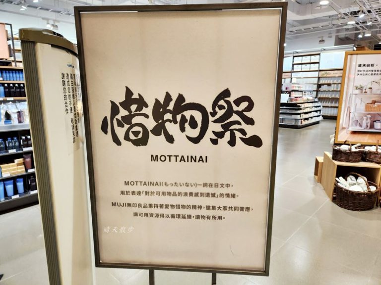 無印良品每年好像都會舉辦惜物祭,現場看板上說明,MOTTAINAI(もったいない)一詞在日文中,用於表達「對於可用物品的浪費感到遺憾」的情緒。