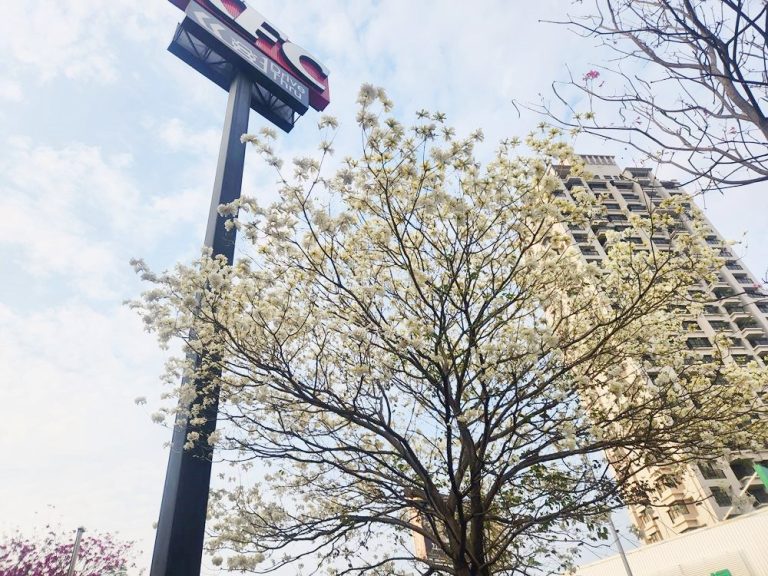 這株白花風鈴木位於肯德基KFC台中五權西二餐廳門口,五權西路有兩家肯德基,是靠近環中路這間,不是靠近大墩路那間,不要跑錯。