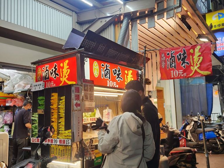 一中夜市有很多攤滷味小吃,這家品香滷味燙位於沒那麼熱鬧的路段,小小一攤,各式加熱滷味食材選擇豐富又平價,還有方便的支付方式,值得一嘗。