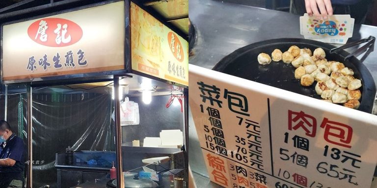 台中中華路夜市小吃中,這家詹記原味生煎包滿受歡迎,有高麗菜包和韭菜豬肉包,菜包7元,肉包13元,兩種都很美味,可以混搭購買。