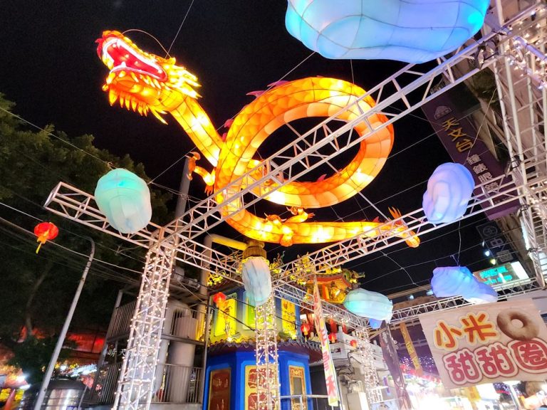 活動這幾天,豐原慈濟宮旁的信義街晚上會封街變成夜市,上方金光閃閃的龍燈籠相當醒目。