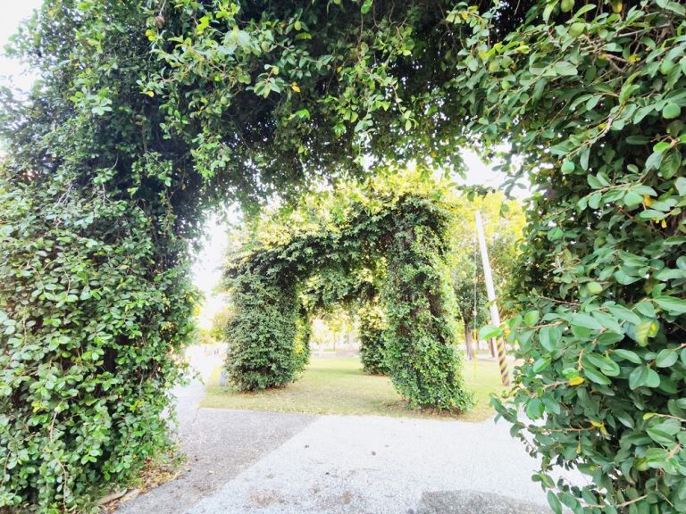 去北屯文昌廟後,對面仁美公園的入口處的林木造景,看起來像一座座拱門,吸引我們的目光。
