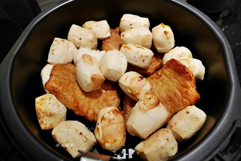 這樣的氣炸結果,肉片外層微酥,肉還挺嫩的,鹹香的口味非常下飯。