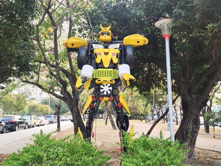 偶爾騎車或搭車經過比較少走的路段,會有意外的驚喜,例如這個南區崇倫里的變形金剛!以各式汽機車回收零件設計改造,結合社區文化和環保訴求,擺在崇倫里綠園道路口,看起來好吸睛!