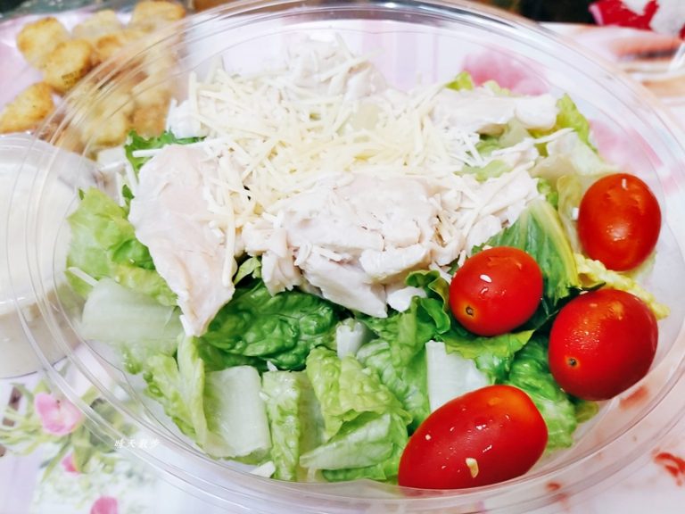 嫩嫩的雞胸肉、蘿美生菜、小番茄、起司絲,另外包裝的麵包丁,以及一碗沙拉醬。