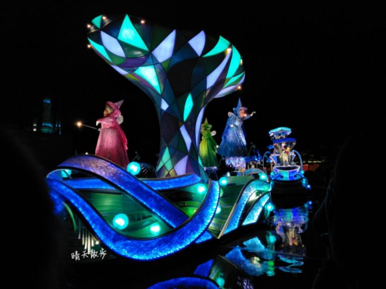 迪士尼樂園的夜間遊行光彩炫目,非常漂亮, 這天下雨,出現的應該是雨天版本的夜間遊行。