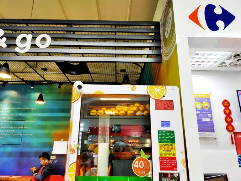 家樂福文心店|鮮榨柳橙汁自動販賣機~不加水、不加冰塊的現榨柳橙汁,一杯40元
