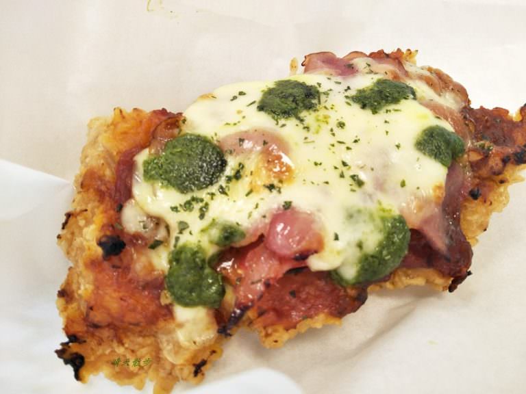 義式三重奏披薩雞腿排本尊是長這個樣子,像是把攤平的雞腿排當餅皮,在上面放上披薩餡料(番茄醬、番茄片、培根),再加上香濃的起司和青醬。