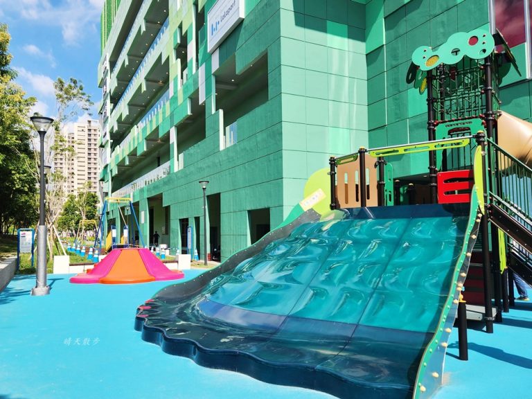 小朋友最愛玩溜滑梯了,廣場上這座巨型滑梯各個方向都有不同造型的滑梯喔!