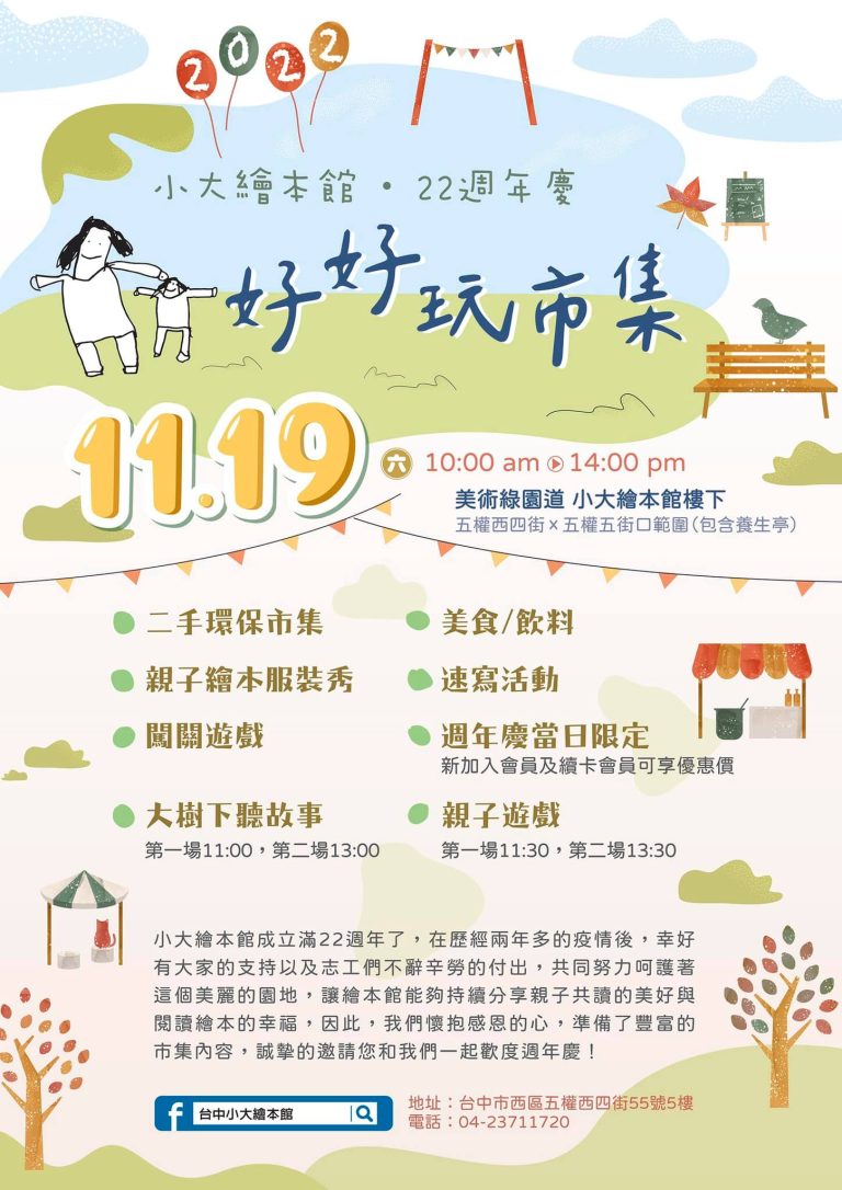 台中小大繪本館22歲了!大家期待已久的週年慶活動在2022/11/19週六登場,當天除了熱鬧滾滾的小大親子環保市集,還有各種闖關活動、說故事活動、親子遊戲,當然也有各種美食、飲料攤位,就在小大繪本館對面的綠園道涼亭區,等著大家來玩喔!