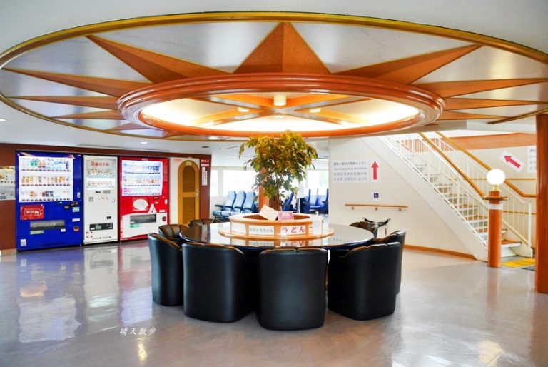 往返宇野港和高松港的四國渡輪船內,看起來挺特別的,中央大廳有圓桌,一旁有自動販賣機和販賣部,吃吃喝喝都有得買。