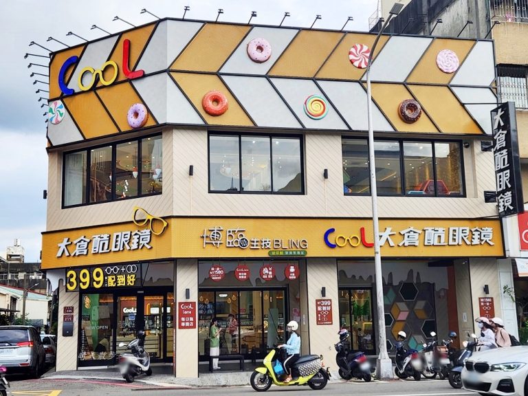 大倉酷眼鏡台中公益店位於公益路近華美街口,點綴著甜甜圈色彩繽紛的外觀很顯眼,真的超像咖啡店或烘焙坊之類的餐廳。