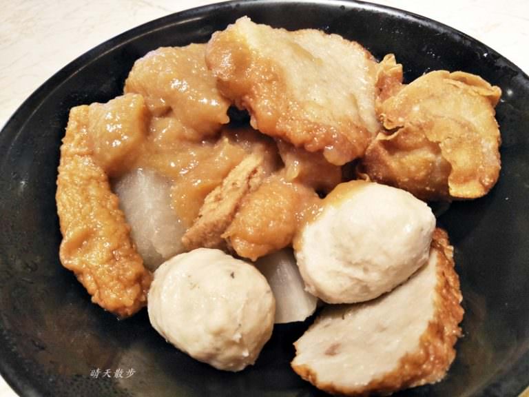 一小碗甜不辣裡,有重點的甜不辣、丸子、油豆腐、菜頭等。