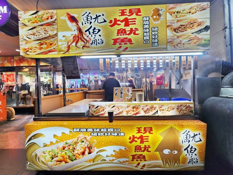 魷魚船一中店位於育才南街上,一中二街購物廣場一樓,現炸魷魚的標示非常明顯。