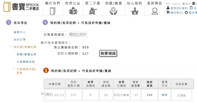 當時寄去的書有一半左右以現金估價方式處理,總共獲得50元😆;可以上架代售的書有19本,售出後可獲得售出所得55%。(扣除15元提款處理費)