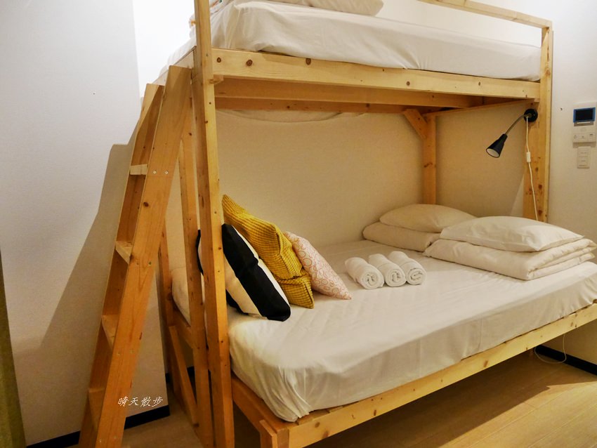 我們訂的是上下舖雙層床的房型。上層是單人床,下層是雙人床,我們兩大一小這樣睡綽綽有餘,不過房內還有個沙發床喔。