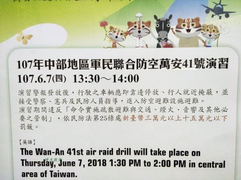 中部萬安演習期間,請民眾暫停戶外所有活動,並請就近避難,不得在外活動、逗留、觀看。